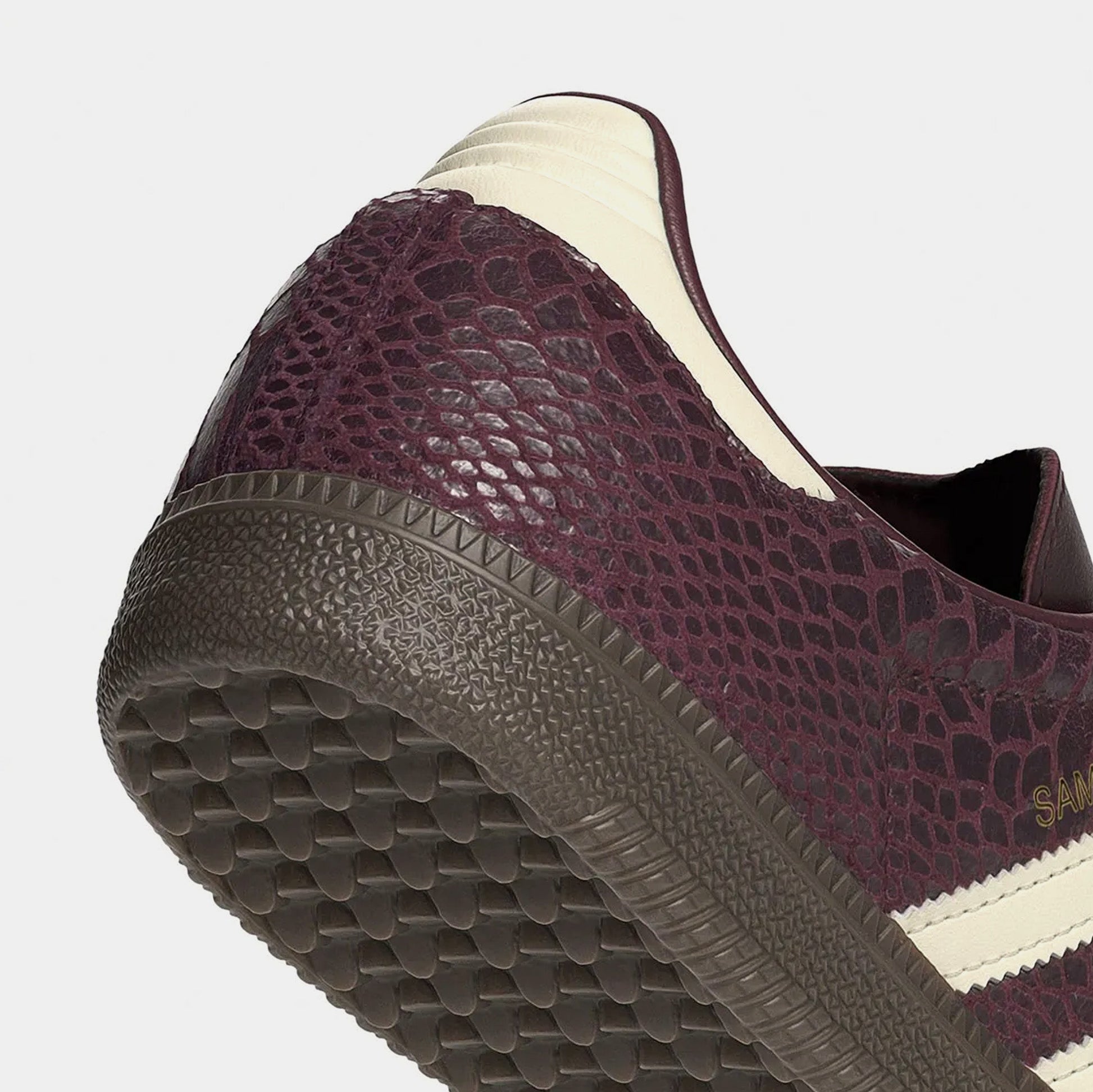 The classic Samba gets a bold makeover with this striking snakeskin-textured edition. Wrapped in a deep burgundy upper, the shoe combines premium reptile-inspired overlays with smooth suede at the toe for a luxe, elevated feel.