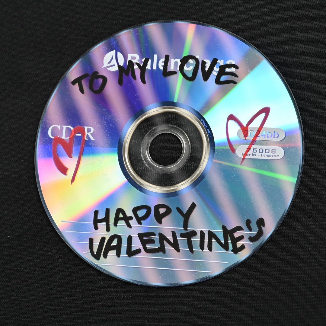 Ce t-shirt Balenciaga arbore un motif CD unique et l'inscription « Joyeuse Saint-Valentin » sur la poitrine. Confectionné en coton noir de haute qualité, il allie confort et style original et audacieux. Parfait pour un look décontracté et tendance, ce t-shirt est un incontournable de toute garde-robe.