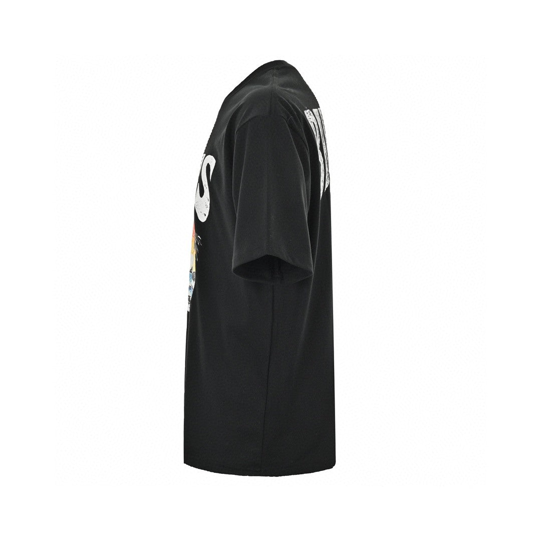 Ce t-shirt Balenciaga arbore un motif graphique audacieux. Sur le devant, le mot « Paris » apparaît en grandes lettres blanches au-dessus d'une illustration éclatante de la Tour Eiffel se détachant sur un coucher de soleil flamboyant bordé de palmiers. Le motif crée un contraste visuel saisissant sur le tissu noir. Idéal pour ajouter une touche parisienne à vos tenues décontractées.
