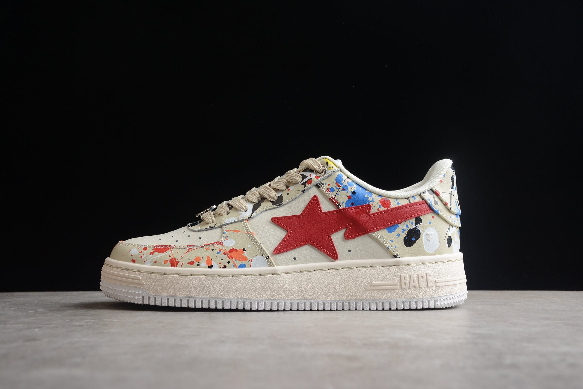 Confectionnée à partir de matériaux haut de gamme, la tige présente une base en cuir beige ornée d'éclaboussures de peinture multicolores dans des tons de rouge, bleu, noir et blanc. Ce design ludique et dynamique est rehaussé par le logo BAPE rouge vif sur le côté, créant un contraste saisissant et une signature unique.
