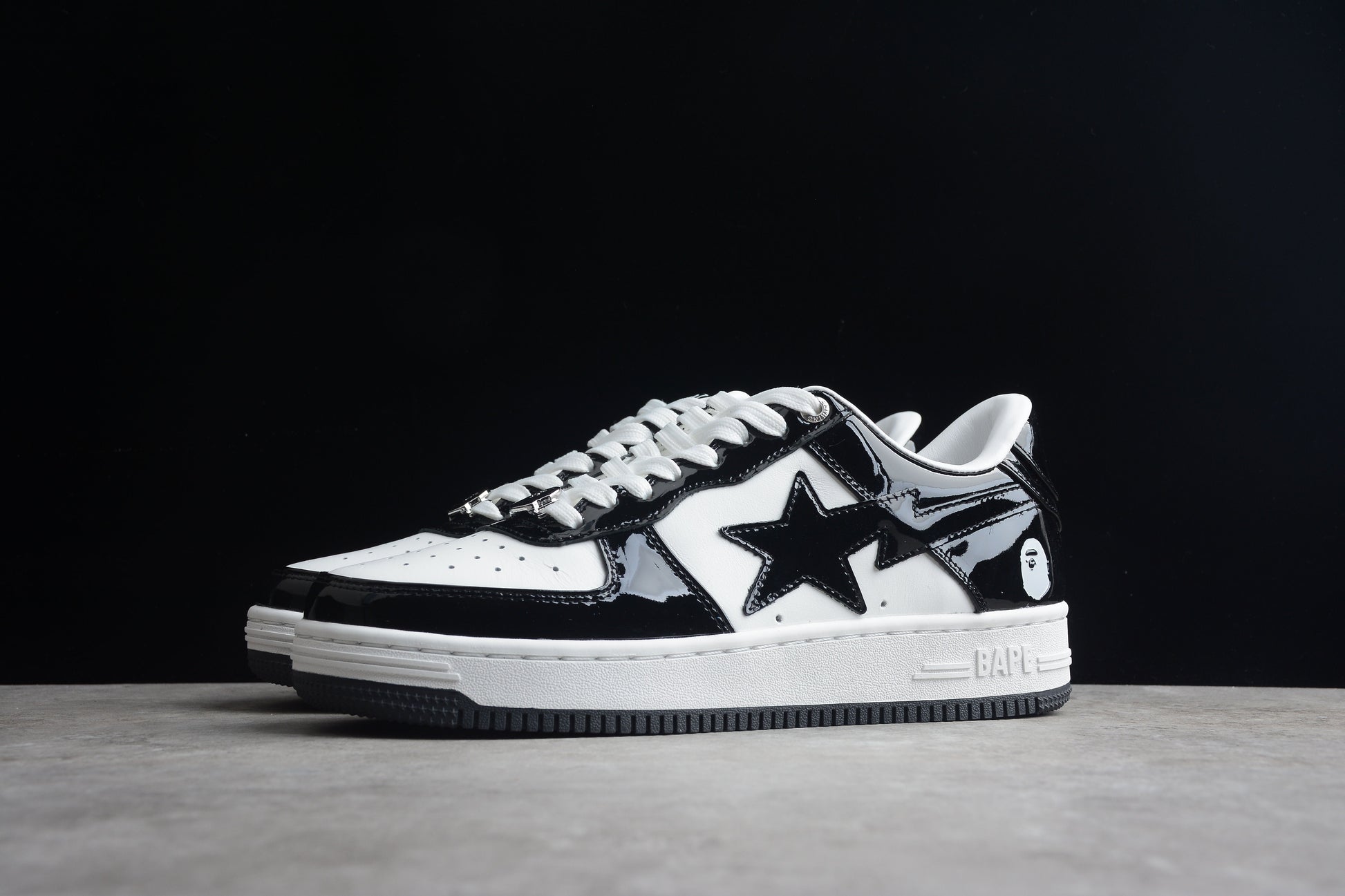 L'empeigne de ces sneakers est confectionnée en cuir premium, arborant un coloris noir et blanc élégant et brillant. Les empiècements en cuir verni noir contrastent avec la base blanche éclatante, créant un effet visuel saisissant. L'emblématique étoile BAPE est fièrement affichée en noir sur les côtés, affirmant l'identité unique de la marque. Enfin, la tête de singe, signature de BAPE, orne le talon, apportant une touche distinctive.