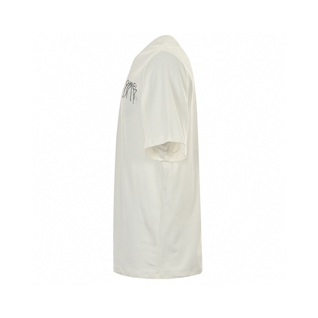 Ce t-shirt blanc Chanel arbore un design minimaliste, orné du logo Chanel en lettres délicates, façon manuscrite, sur la poitrine gauche. Sa simplicité et son élégance en font une pièce polyvalente, idéale pour des tenues décontractées ou plus habillées. Confectionné dans un tissu de haute qualité, il allie confort et style, pour s'adapter à toutes les occasions.