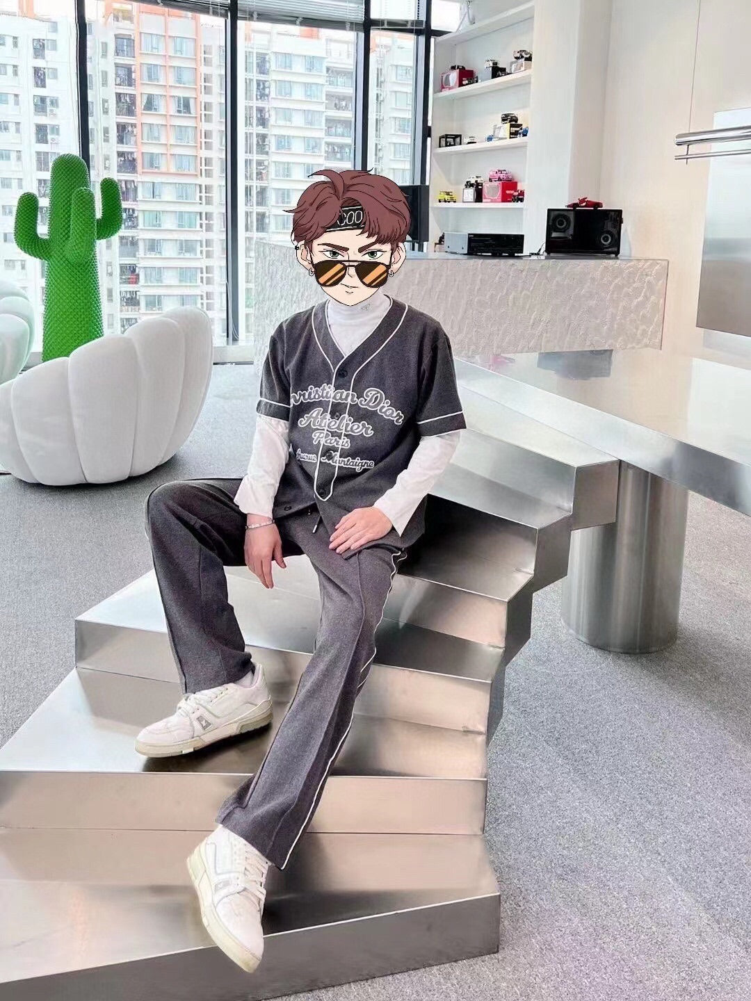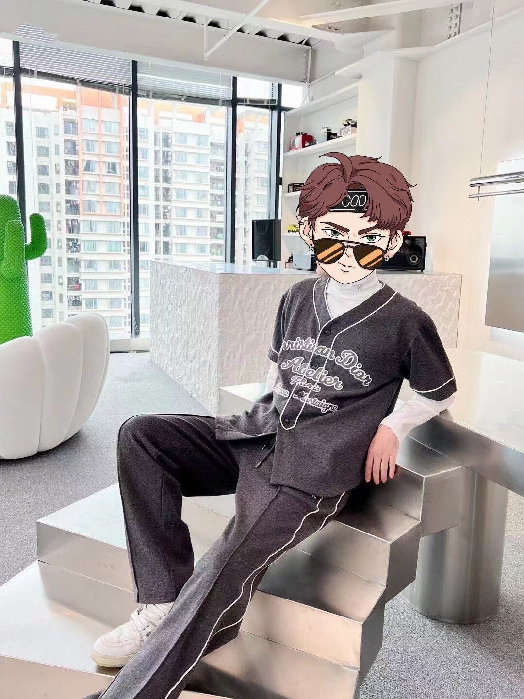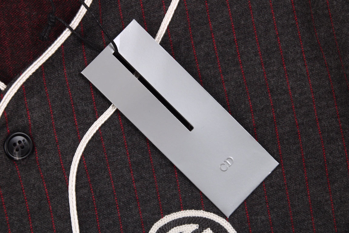 Chemise noire style baseball avec liseré blanc et fermeture boutonnée sur le devant. Inscription « Christian Dior Atelier Paris Avenue Montaigne » en caractères gras sur le devant. Conçue pour un look à la fois sportif et élégant.