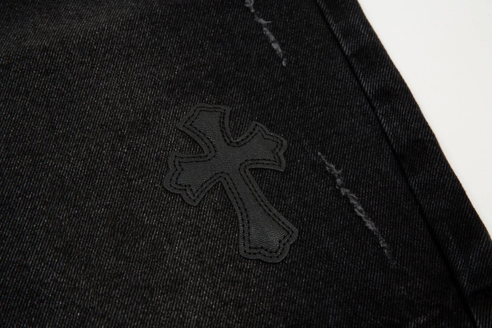 Design : Empiècements croisés en cuir Chrome Hearts noir ton sur ton pour un look discret et haut de gamme