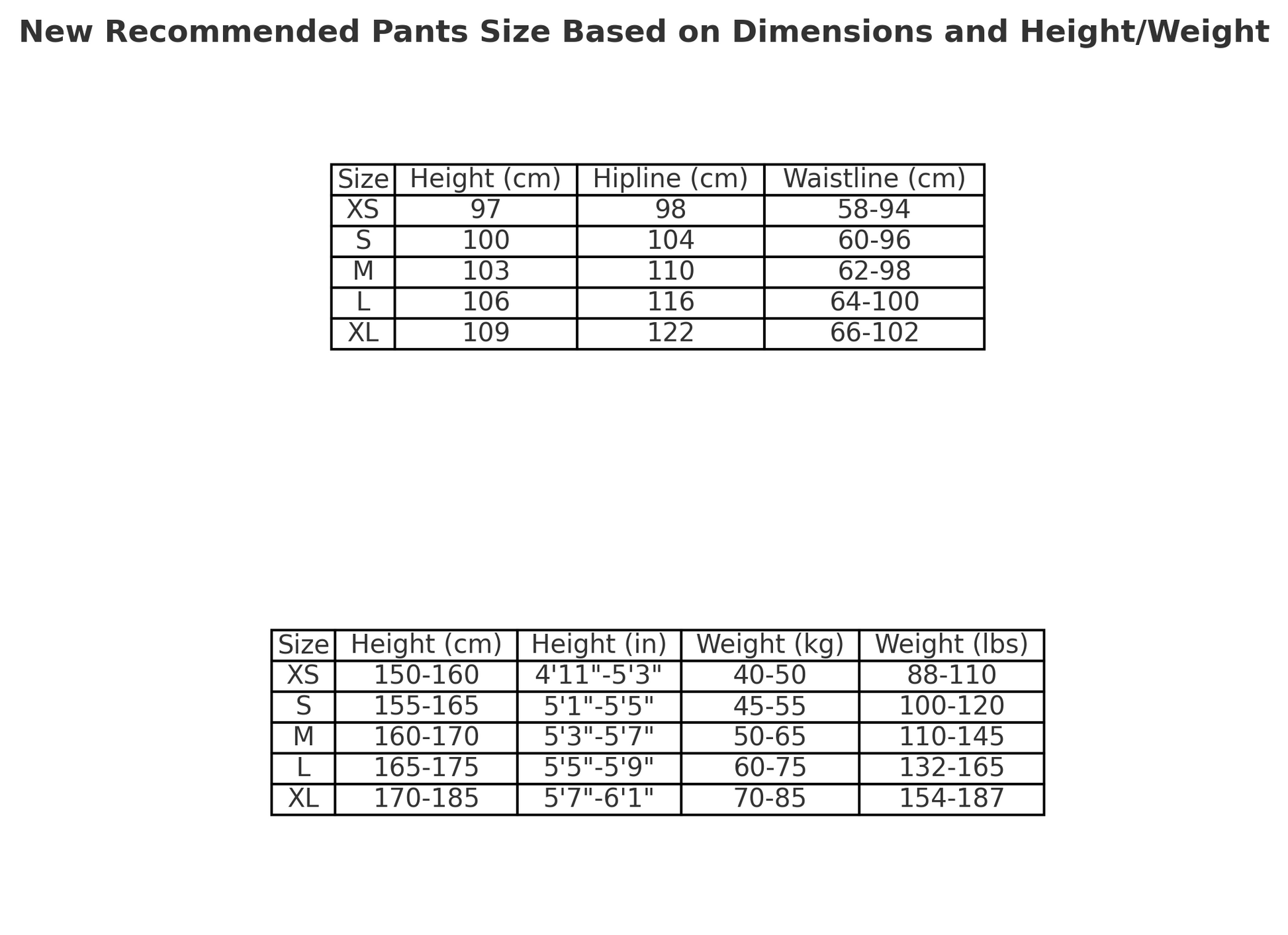 Tableau des Tailles