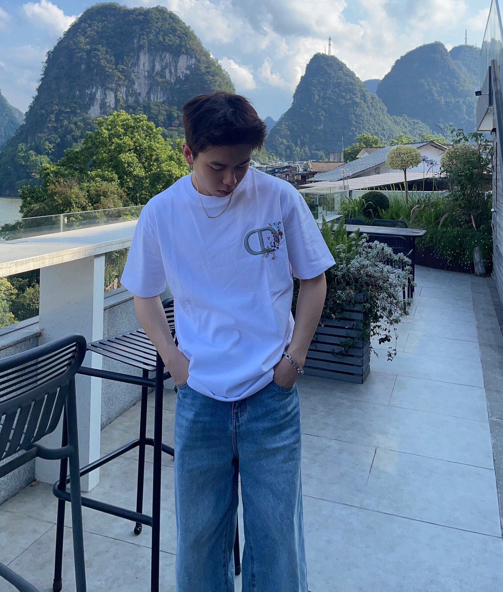 Ce t-shirt Dior arbore un logo CD à motif floral. Blanc, il est orné de détails floraux colorés. Idéal pour un look élégant et moderne.