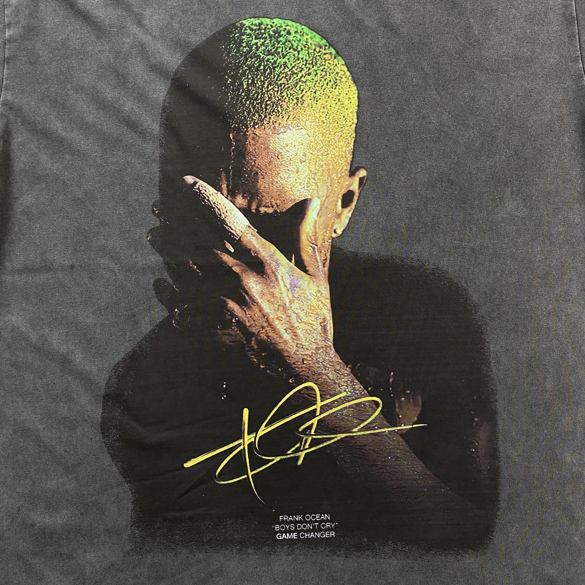 Le t-shirt graphique vintage FRANK OCEAN gris foncé (réplique) allie l'esprit artistique à l'esthétique streetwear vintage , ce qui en fait un incontournable pour les fans de cette icône inclassable. Confectionné en coton doux au toucher de qualité supérieure , ce t-shirt offre un confort optimal et un aspect déjà porté , pour un style rétro authentique.