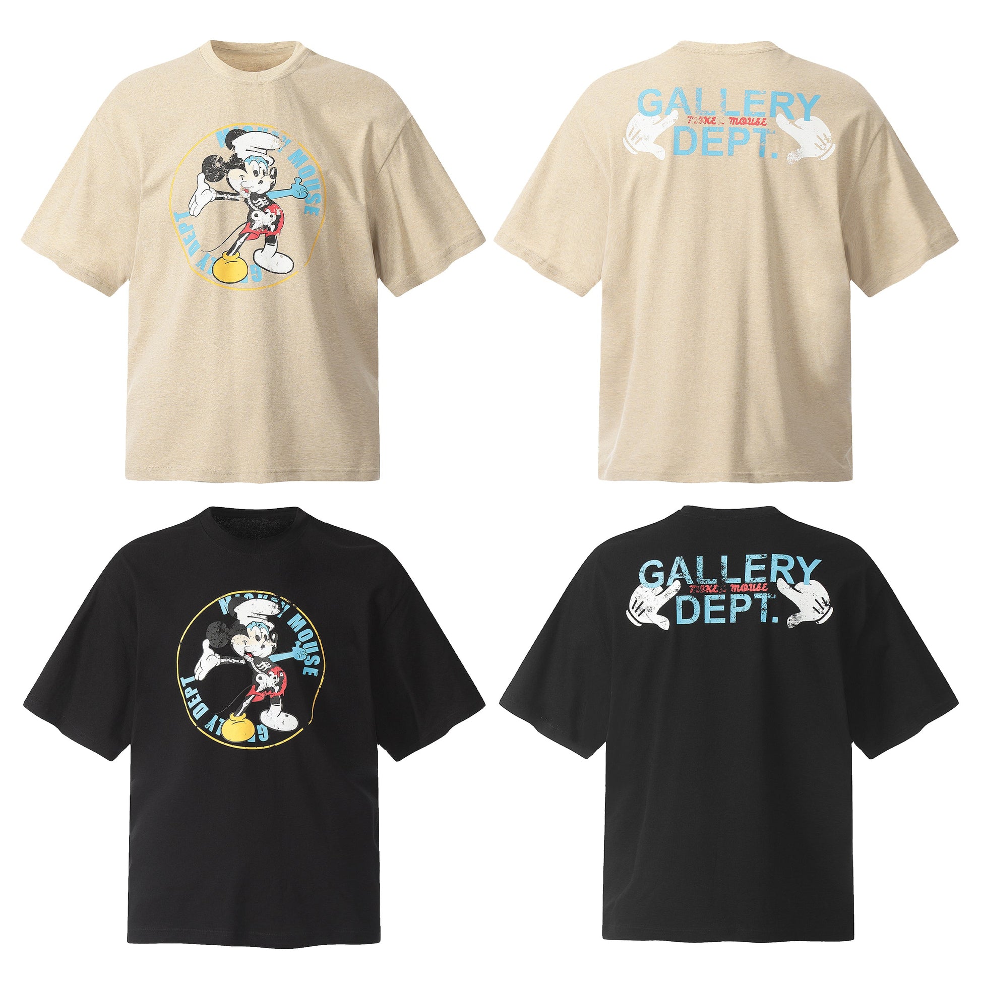 Le devant du t-shirt arbore un motif ludique et rétro de Mickey Mouse, aux couleurs vives et à l'esprit vintage. Le personnage emblématique est entouré des inscriptions « Gallery Dept. » et « Mickey Mouse », créant un design amusant et attrayant qui rend hommage à l'animation classique tout en incarnant les tendances de la mode contemporaine.