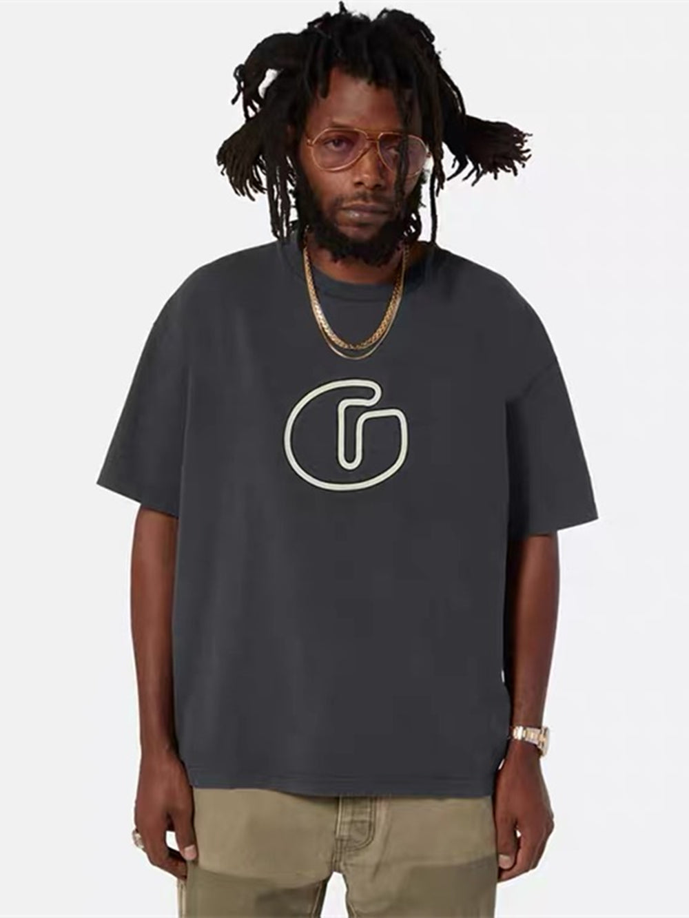 Le design met en valeur un logo « G » bien visible au centre de la poitrine. Ce logo minimaliste, aux lignes épurées et modernes, apporte une touche de sophistication au t-shirt. La simplicité du design permet de l'associer facilement à différentes tenues, ce qui en fait une pièce incontournable de toute garde-robe.