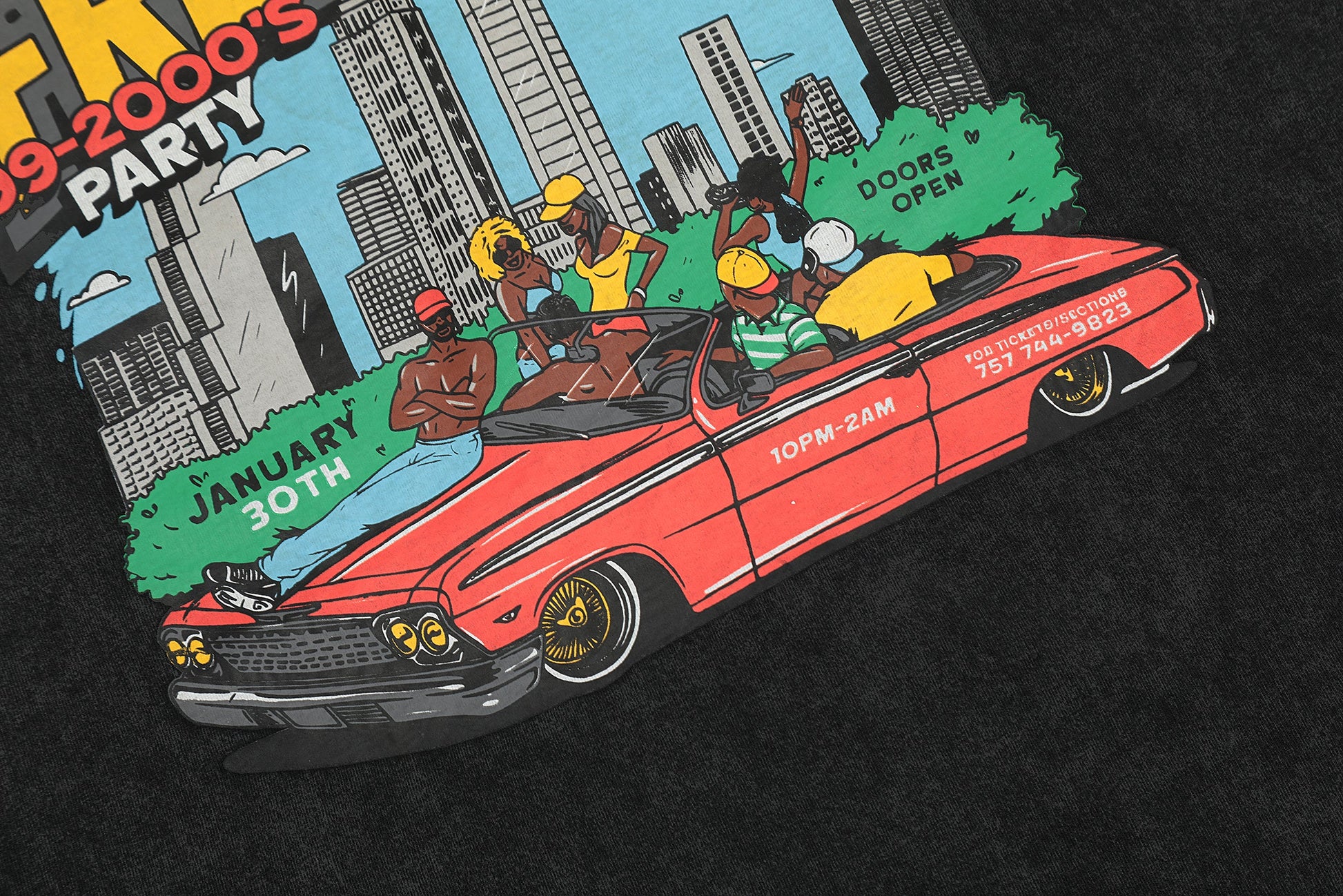 Le devant du t-shirt arbore un motif graphique dynamique et ludique, inspiré du festival mythique Freaknik, symbole de joie et d'exubérance juvénile. Ce dessin coloré met en scène une rue animée, avec des personnages animés à bord d'un cabriolet rouge classique, sur fond de panorama urbain bouillonnant. L'inscription « Freaknik » en jaune vif crée un contraste saisissant, capturant l'esprit festif des années 90.