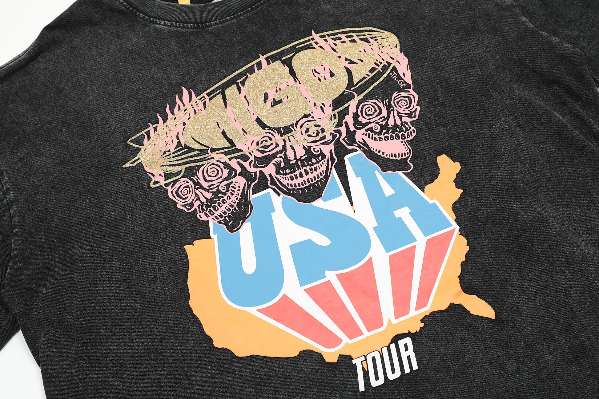 Sur le devant, le t-shirt arbore un grand motif saisissant représentant un crâne orné de roses, sur fond de carte des États-Unis. En dessous, l'inscription « USA Tour » s'affiche en lettres capitales dans une palette de couleurs rétro et dynamiques, mêlant nuances de rose, de bleu et d'orange. Ce design original capture l'essence même des produits dérivés de tournées rock, en faisant une pièce unique qui rend hommage à l'Amérique traditionnelle et à l'esprit rebelle du rock and roll.