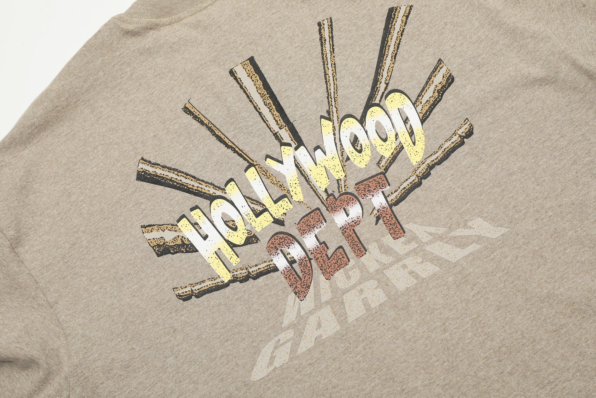 Ce t-shirt se distingue par son imprimé original au dos. L'inscription « HOLLYWOOD DEPT » en gras est mise en valeur, entourée d'un motif soleil dynamique. Ce visuel éclatant attire le regard et reflète l'énergie et l'esprit artistique d'Hollywood. L'effet vieilli de l'impression lui confère un charme vintage, sublimant l'esthétique générale du t-shirt.