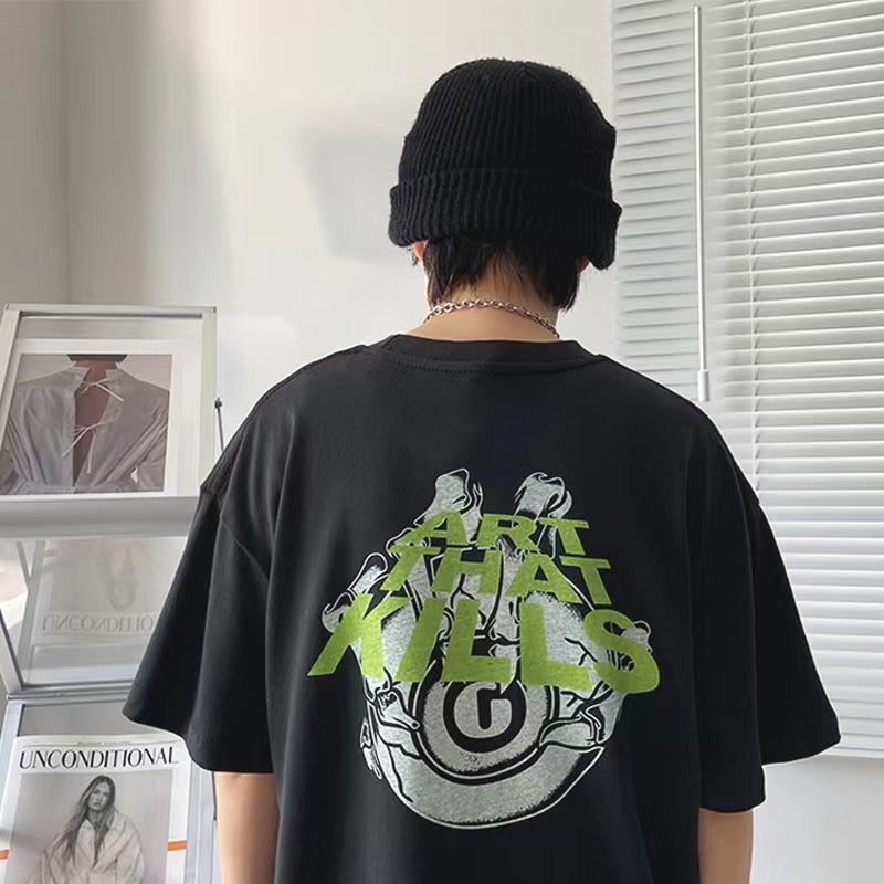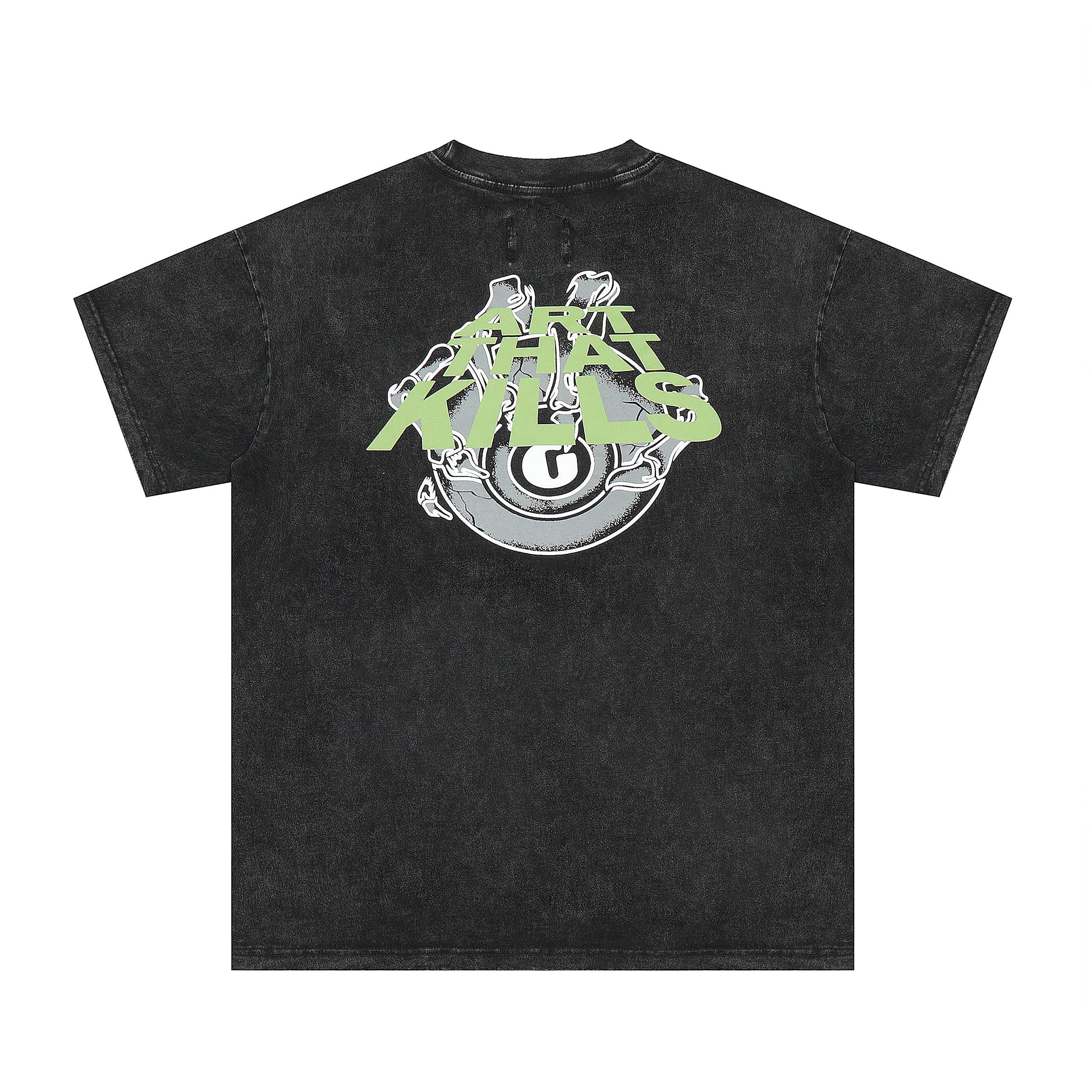 Le devant du t-shirt est orné d'un petit emblème détaillé sur la poitrine gauche, signature de Gallery Dept. Au dos, un grand motif saisissant représente un appareil photo rétro, sur lequel est superposée la phrase « Art Kills » en vert fluo éclatant. Ce design percutant capture l'esprit rebelle et créatif de la marque et affirme avec force l'impact de l'art.