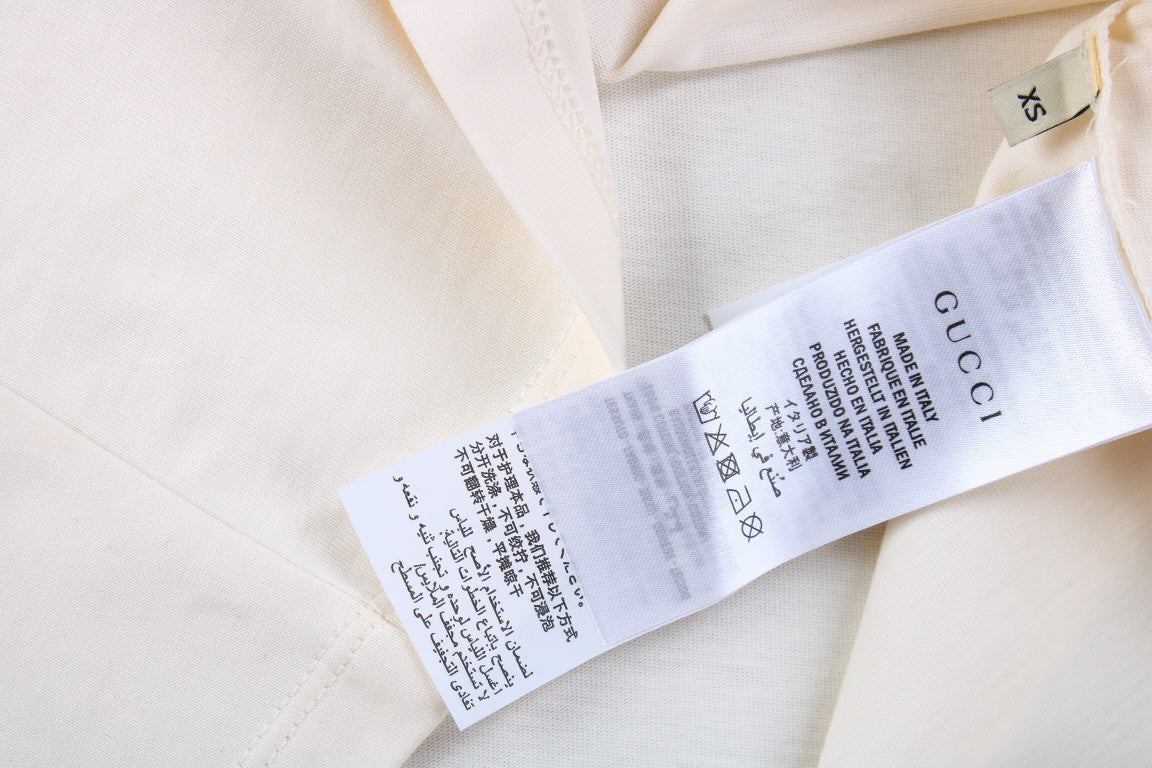Ce t-shirt Gucci unique arbore un adorable imprimé représentant un chien portant un harnais Gucci rose vif sur un fond crème doux. Son motif, à la fois original et élégant, est idéal pour celles et ceux qui aiment allier style et fantaisie. Ce t-shirt est parfait pour les sorties décontractées où afficher un look tendance et amusant est essentiel.