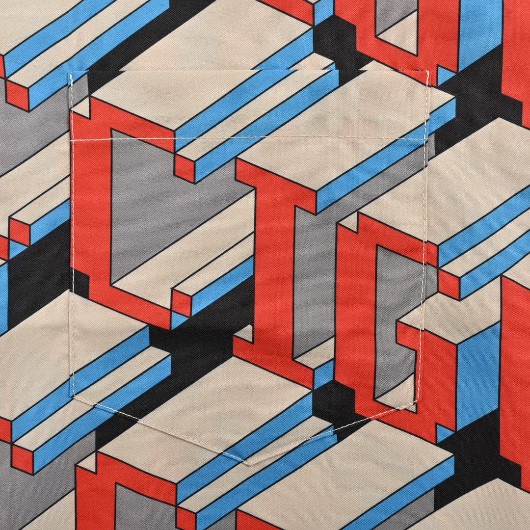 Cette chemise Gucci arbore un imprimé logo géométrique saisissant aux tons rouge, bleu et gris éclatants. Son design audacieux et dynamique en fait une pièce maîtresse pour un look moderne et élégant, idéale pour affirmer sa personnalité.