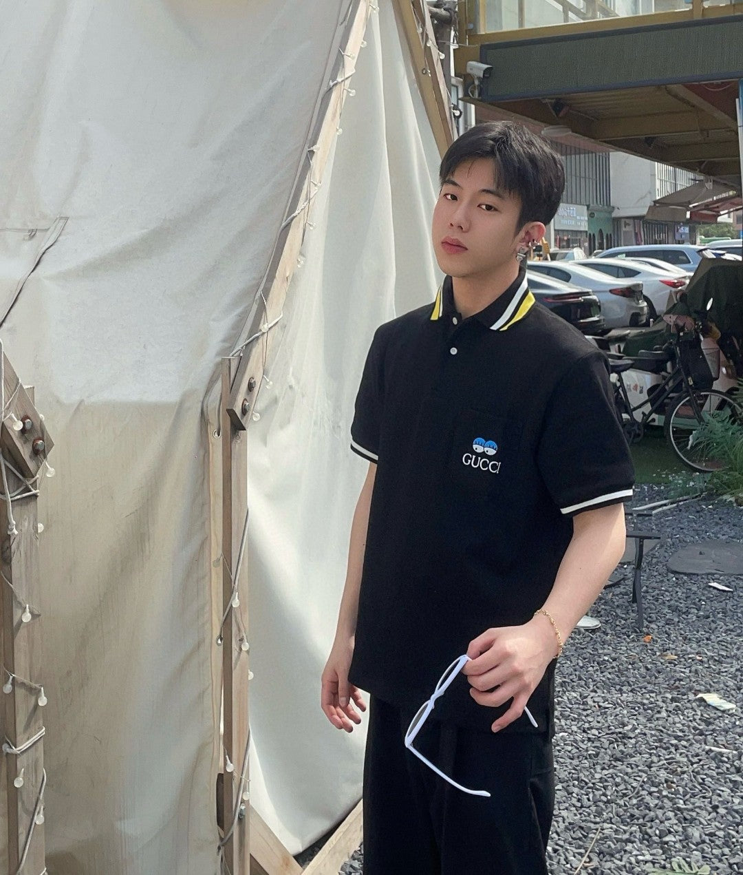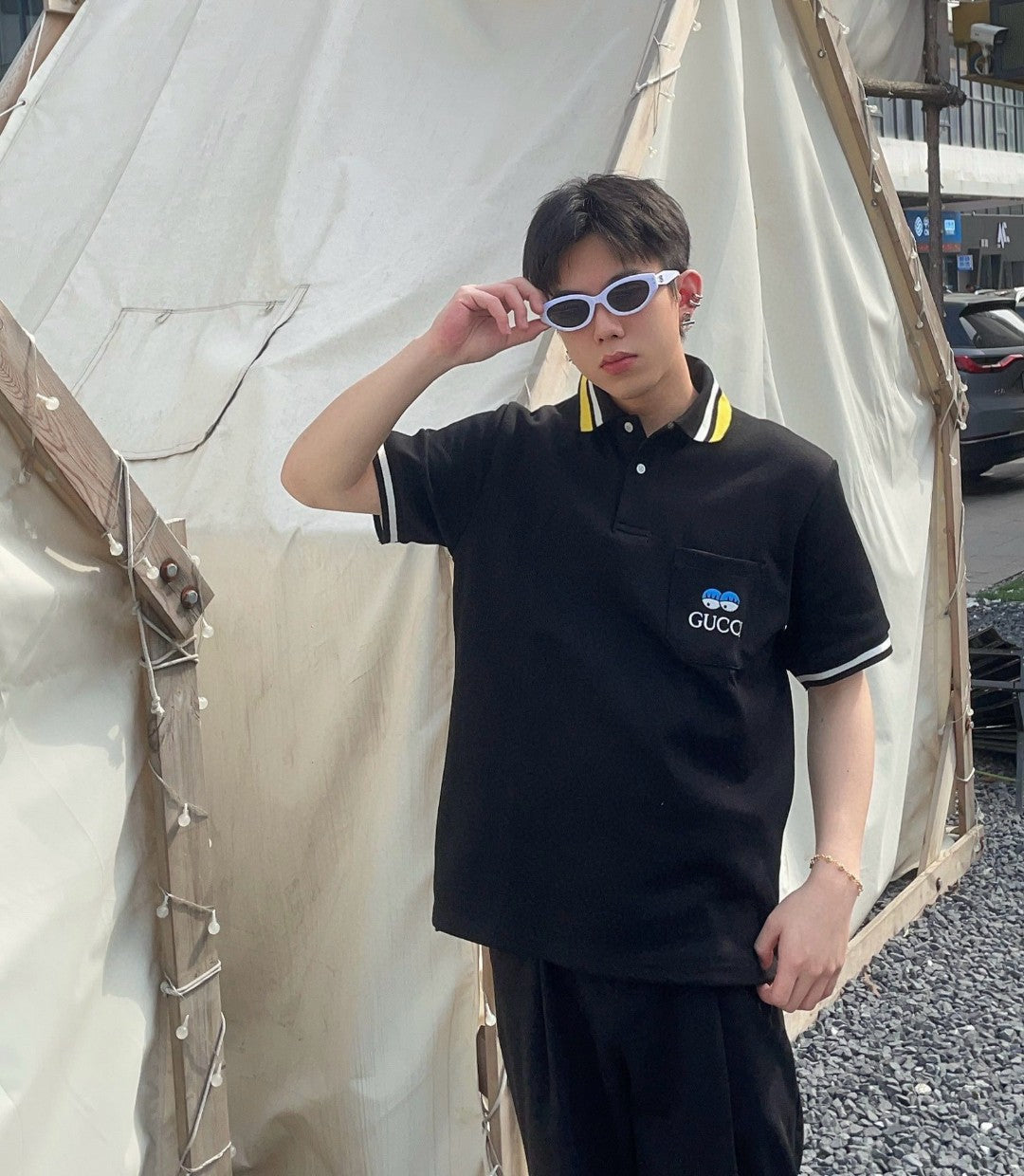 Ce polo Gucci arbore un design noir épuré, rehaussé de finitions blanches et jaunes au col et aux manches. Il est doté d'une poche poitrine ornée du logo Gucci et d'un petit motif représentant deux visages. Son col polo classique et sa patte de boutonnage en font le vêtement idéal pour une allure décontractée et raffinée. Parfait pour apporter une touche de sophistication à votre garde-robe.