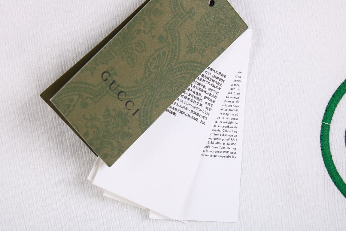 Polo blanc orné d'un logo Gucci vert brodé sur la poitrine. Col et manches aux détails verts contrastent avec élégance. Confectionné en coton premium pour un confort optimal et une coupe classique. Idéal pour un look casual chic.