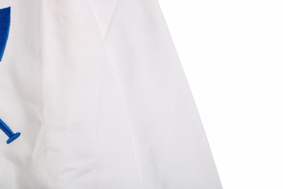 Ce sweat à capuche Gucci x Adidas est confectionné en tissu blanc et arbore le logo trèfle bleu emblématique d'Adidas ainsi que le nom Gucci sur le devant. Il est doté d'une capuche à cordon et d'une poche kangourou, alliant style et fonctionnalité. Ses poignets et son ourlet côtelés assurent un confort optimal, ce qui en fait un choix idéal pour un look décontracté.