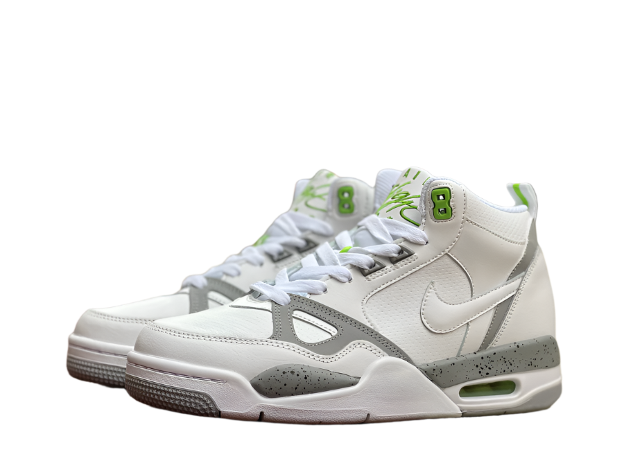 L'empeigne de la sneaker présente une base en cuir blanc immaculé, offrant une silhouette élégante et polyvalente. Les empiècements latéraux sont ornés d'un daim gris lisse, apportant texture et profondeur au design. Le point fort de la chaussure réside dans les touches de vert vif qui illuminent le logo Jumpman, la semelle extérieure et la doublure intérieure, insufflant une note de couleur et une allure sportive à l'ensemble.