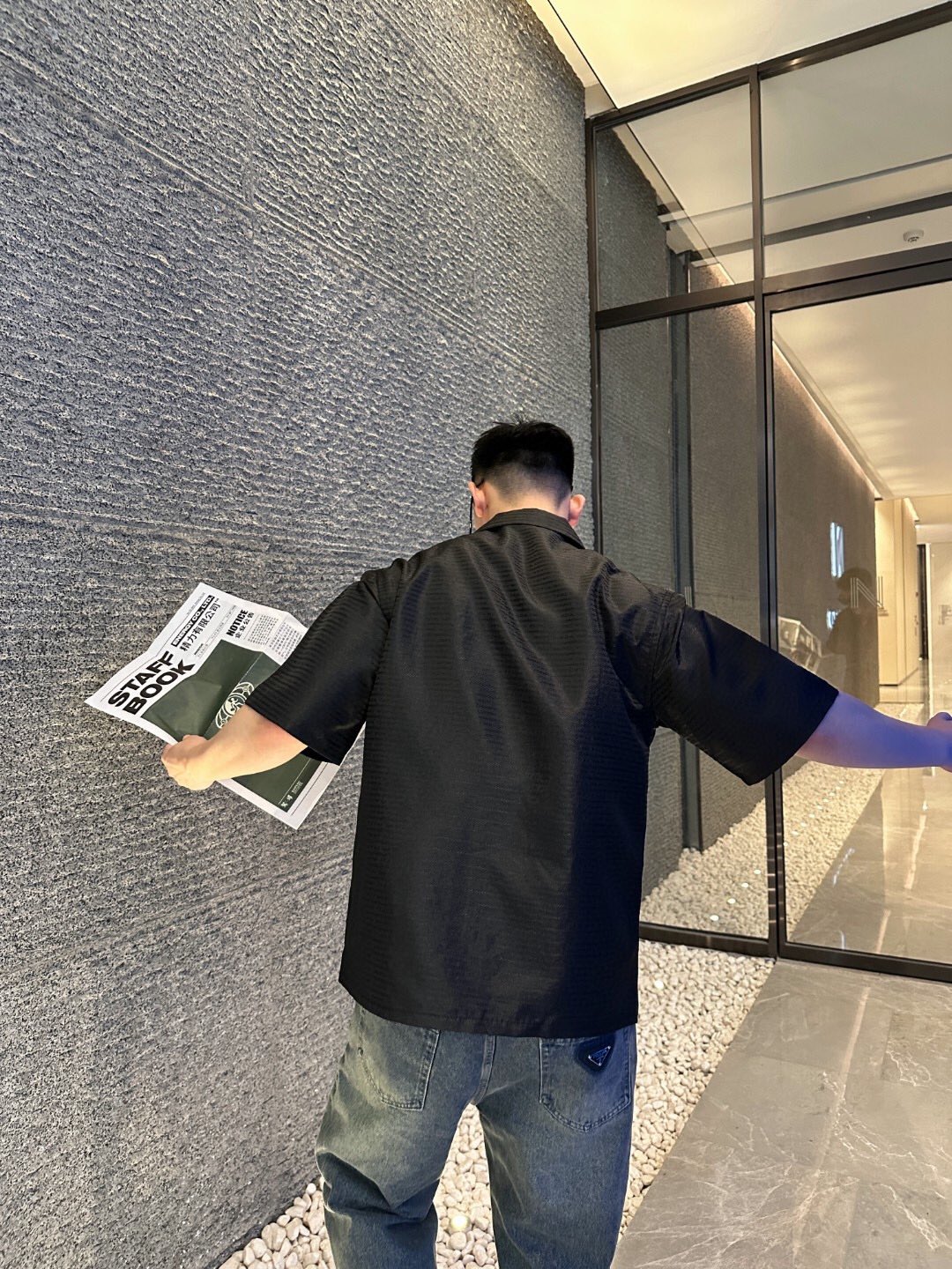 Une chemise zippée Prada élégante au design minimaliste. De couleur noire avec un motif discret, elle possède des manches courtes et une poche poitrine ornée du logo iconique Prada. Parfaite pour un look sophistiqué et décontracté.