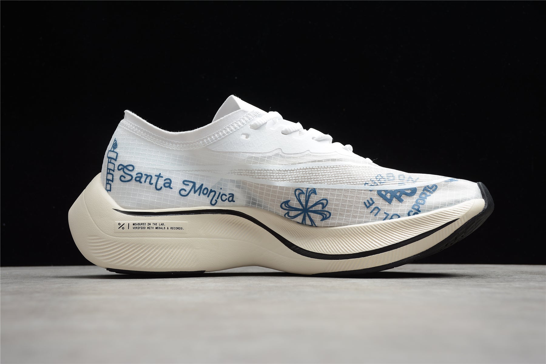 L'empeigne est confectionnée en AtomKnit, une version améliorée du FlyKnit de Nike. L'AtomKnit offre une chaussure légère et respirante qui épouse la forme du pied, garantissant un confort et un maintien optimaux. Ce matériau minimise également l'absorption d'eau, préservant ainsi la légèreté de la chaussure même par temps humide. L'empeigne blanche ornée de motifs bleus, incluant des phrases inspirantes et des dessins artistiques, apporte une touche personnalisée qui ne passe pas inaperçue sur piste ou sur route.