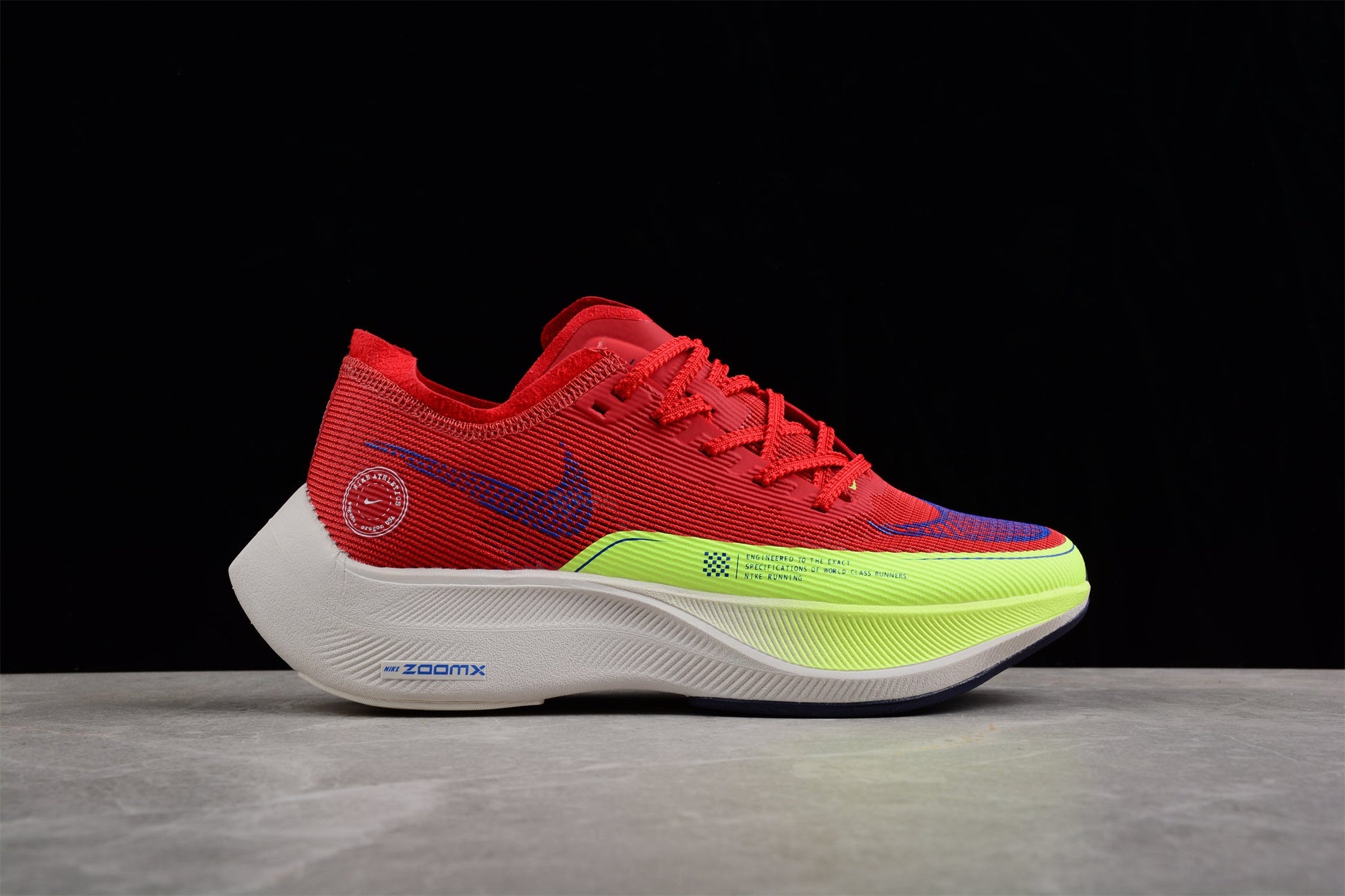 La Nike ZoomX Vaporfly NEXT% 2 est conçue pour les coureurs d'élite exigeants qui recherchent performance optimale et style affirmé. Ce modèle arbore une empeigne rouge éclatante rehaussée de touches de vert fluo et de bleu, ce qui en fait un choix idéal pour la compétition.