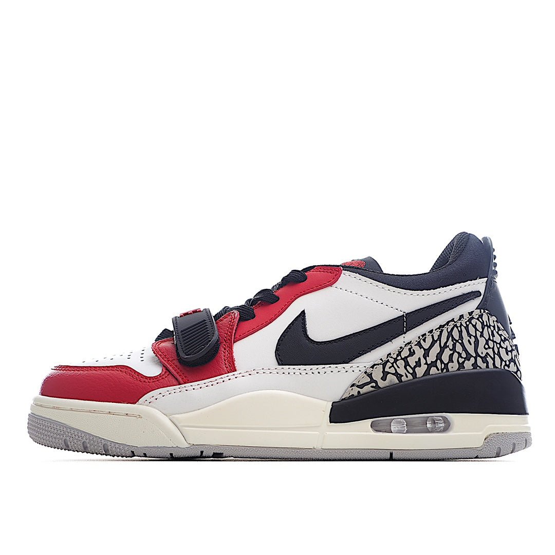 The upper is crafted from premium white leather, providing a clean and versatile base. The signature patent leather mudguard is also white, ensuring a sleek and unified appearance. The shoe's standout feature is the vibrant red accents, which are prominently featured on the Jumpman logo, the lace eyelets, and the inner lining. These red elements add a dynamic pop of color, reflecting the classic Chicago Bulls' colorway and enhancing the sneaker's visual appeal.