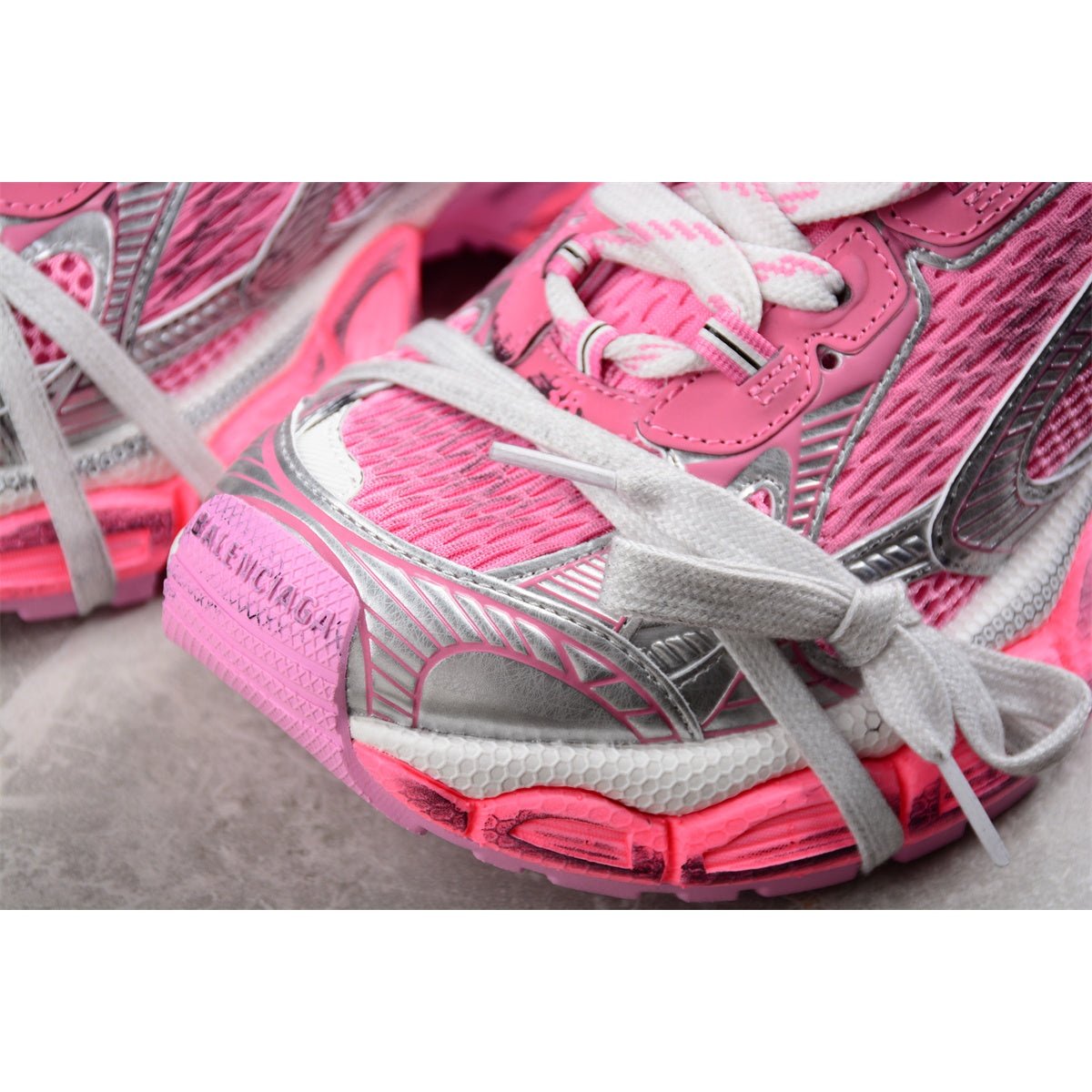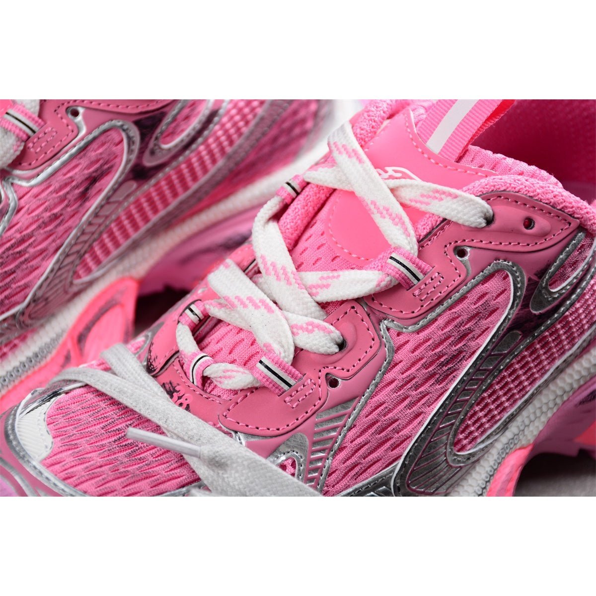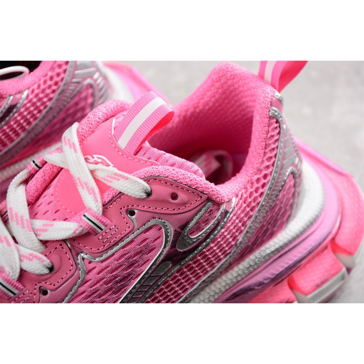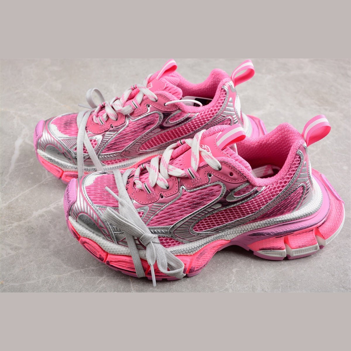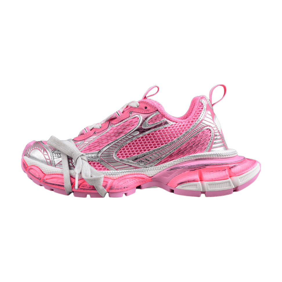 The BALENCIAGA 3XL x Pink Silver sneakers are a stunning expression of contemporary fashion, blending bold colors with metallic accents. This striking pair showcases a vibrant pink upper complemented by shimmering silver details that catch the light with every step. Crafted with exceptional materials, these sneakers maintain the oversized, chunky silhouette characteristic of the 3XL line, offering both standout style and ultimate comfort. The robust, layered soles enhance durability and provide a dramatic lift, while the sleek design lines ensure a sophisticated profile. Ideal for those who embrace bold fashion statements, the 3XL x Pink Silver sneakers are both eye-catching and elegant.