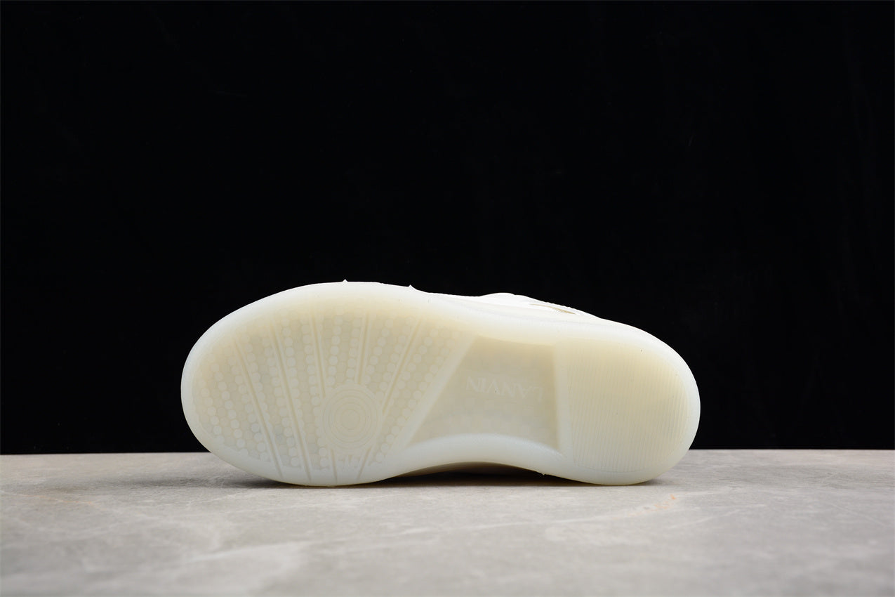 **Materials and Construction:** The sneakers feature a premium combination of leather and suede, ensuring durability and a luxurious feel. The upper is crafted from smooth white leather, complemented by suede overlays that add texture and sophistication. The sneakers also boast a unique, semi-translucent sole that provides a modern twist to the classic design.