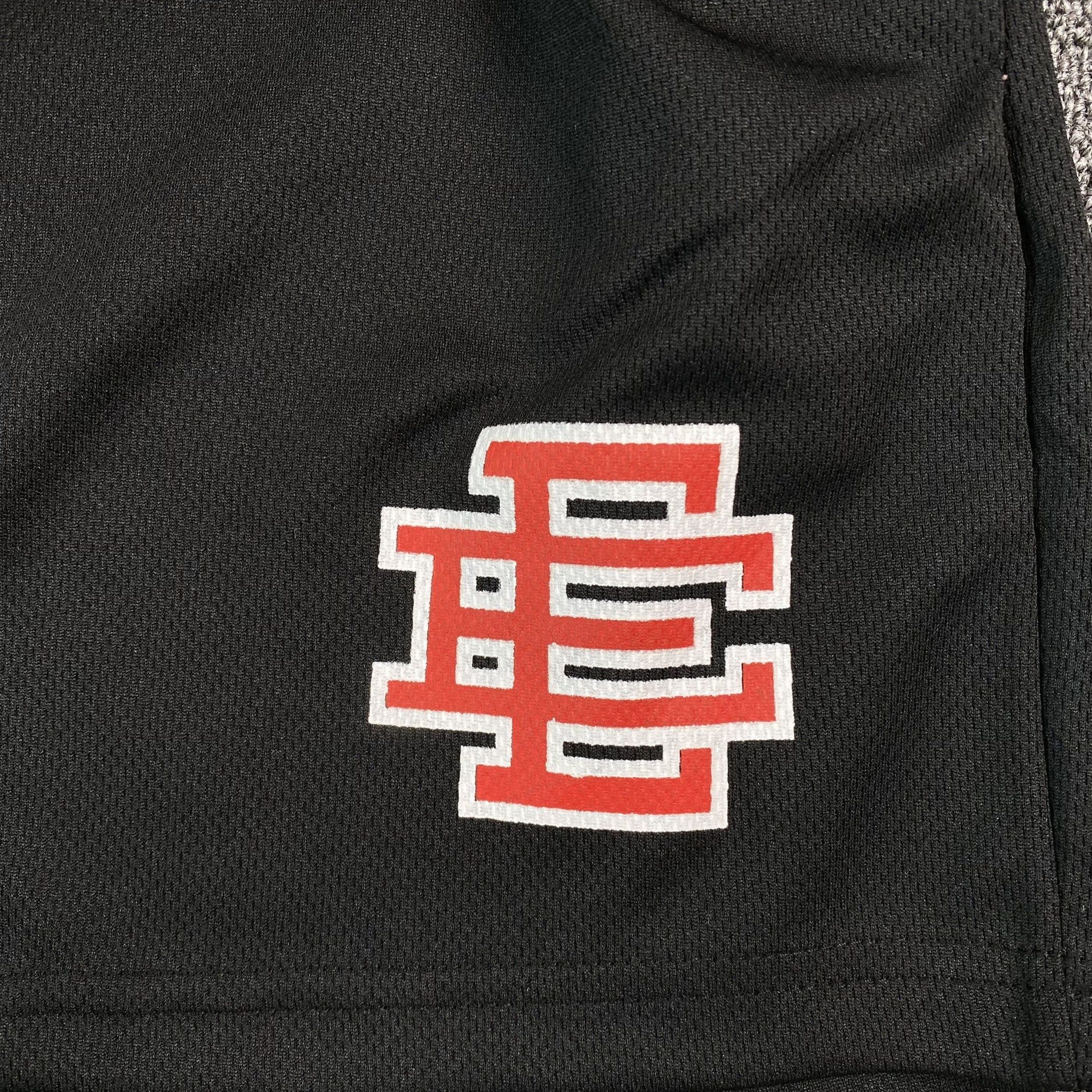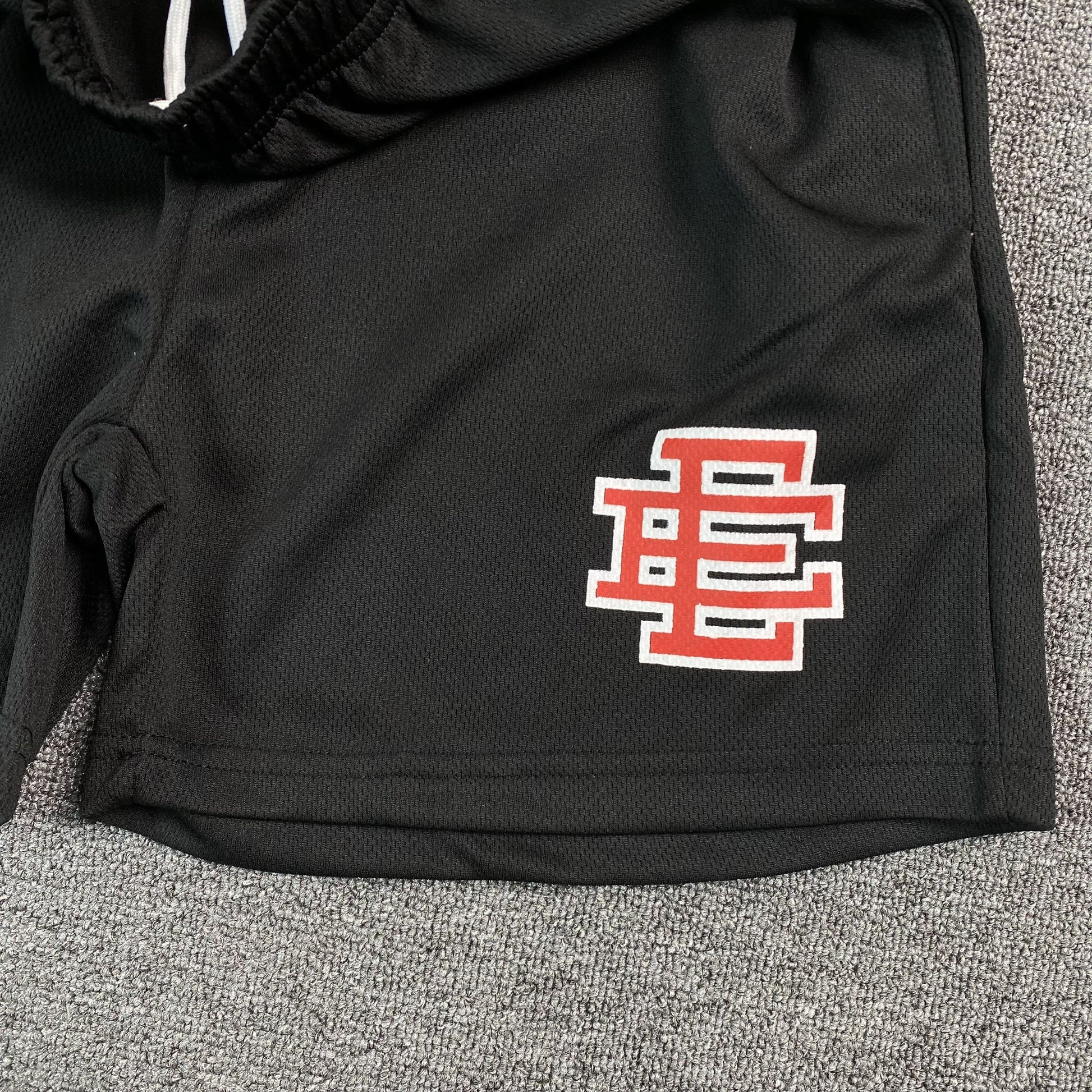 Designed in a sleek black base with striking red accents, these shorts feature the iconic EE logo, adding a signature touch to the classic silhouette. The elastic waistband with an adjustable drawstring ensures a secure and personalized fit, making them ideal for lounging, basketball, or elevating your streetwear look.