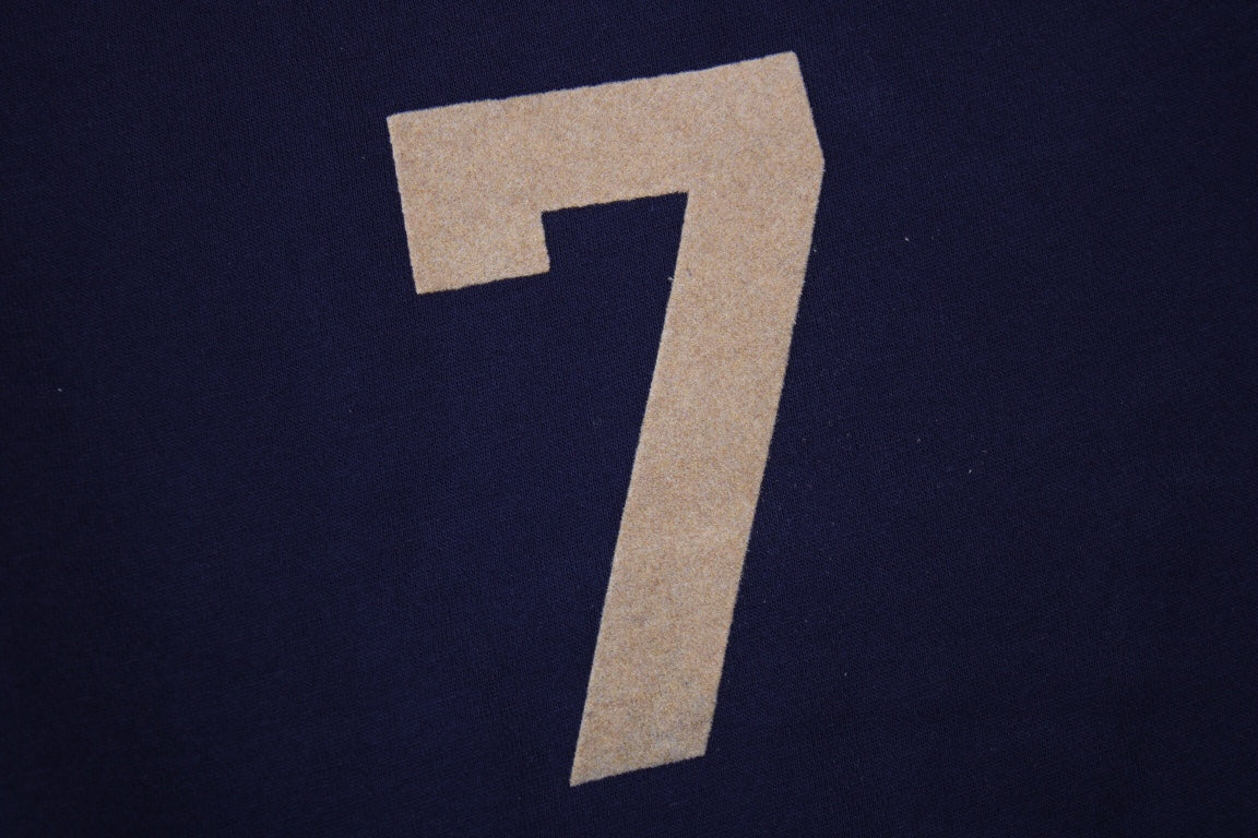 Navy blue hoodie with tan "7" print on the chest. Comfortable and cozy fit. Features a front kangaroo pocket and drawstring hood. Ideal for casual and stylish wear.