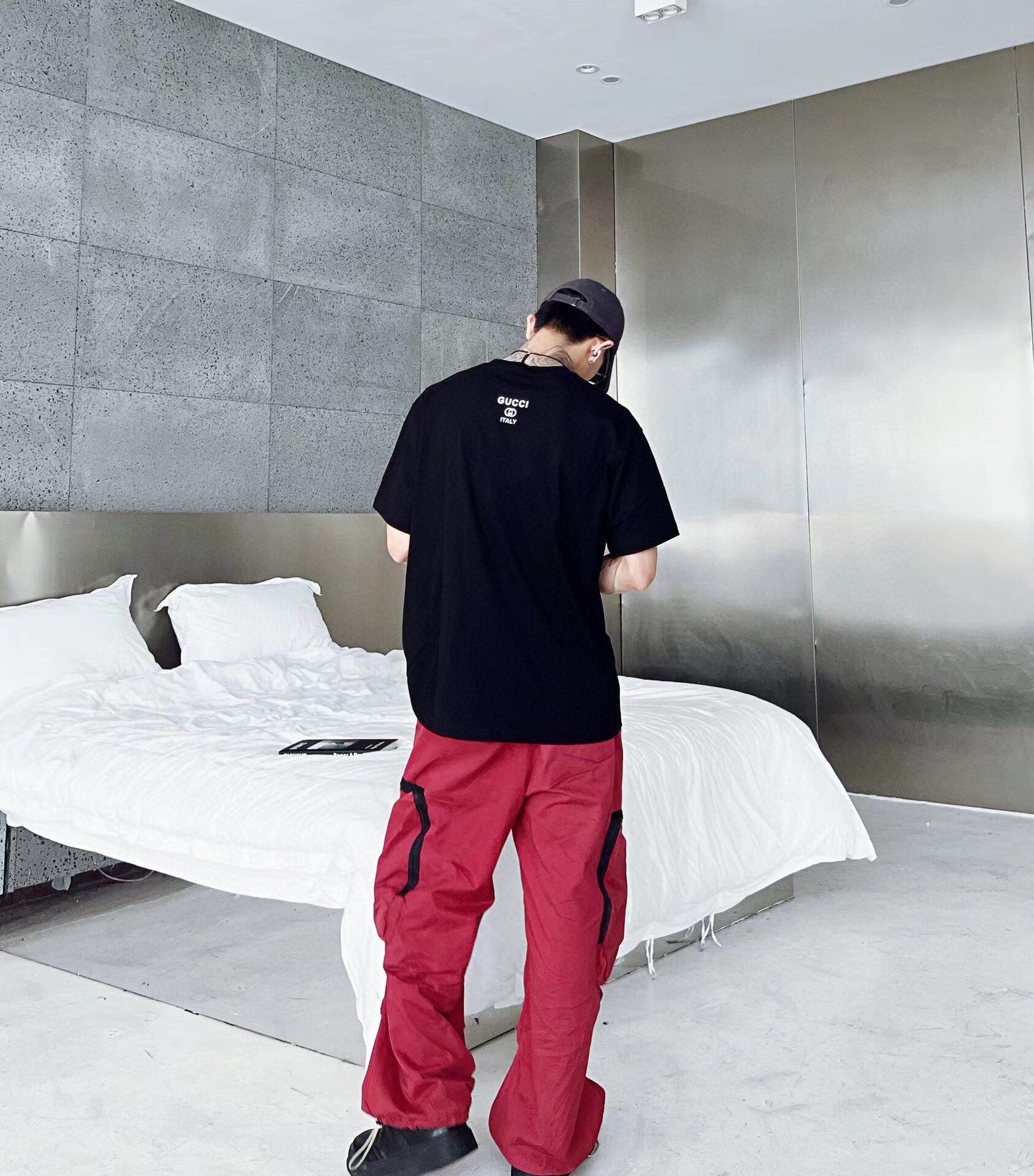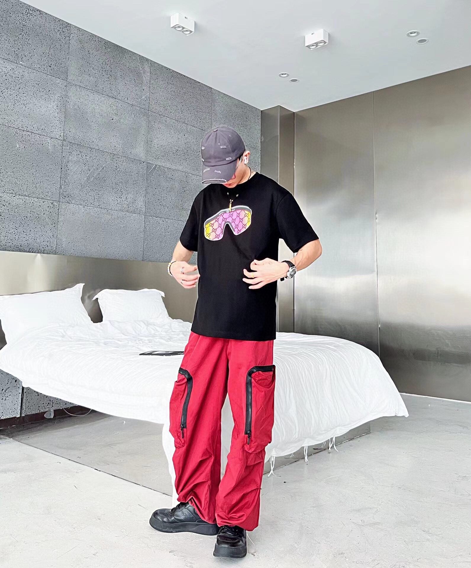 This black Gucci t-shirt showcases a striking graphic of oversized sunglasses emblazoned across the chest. The sunglasses feature the iconic interlocking GG pattern in pink and yellow, offering a vibrant contrast against the shirt's dark background. It's a bold choice for those looking to make a statement with their casual wear.