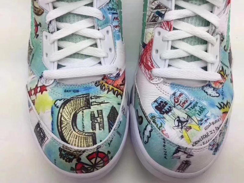 The upper is crafted from premium leather, providing both durability and a comfortable fit. The colorful design elements are complemented by mint green accents on the midsole, eyelets, and lace locks, adding a fresh contrast to the intricate artwork. The sneaker also includes a translucent outsole, which not only adds to its visual appeal but also enhances traction and stability on various surfaces.