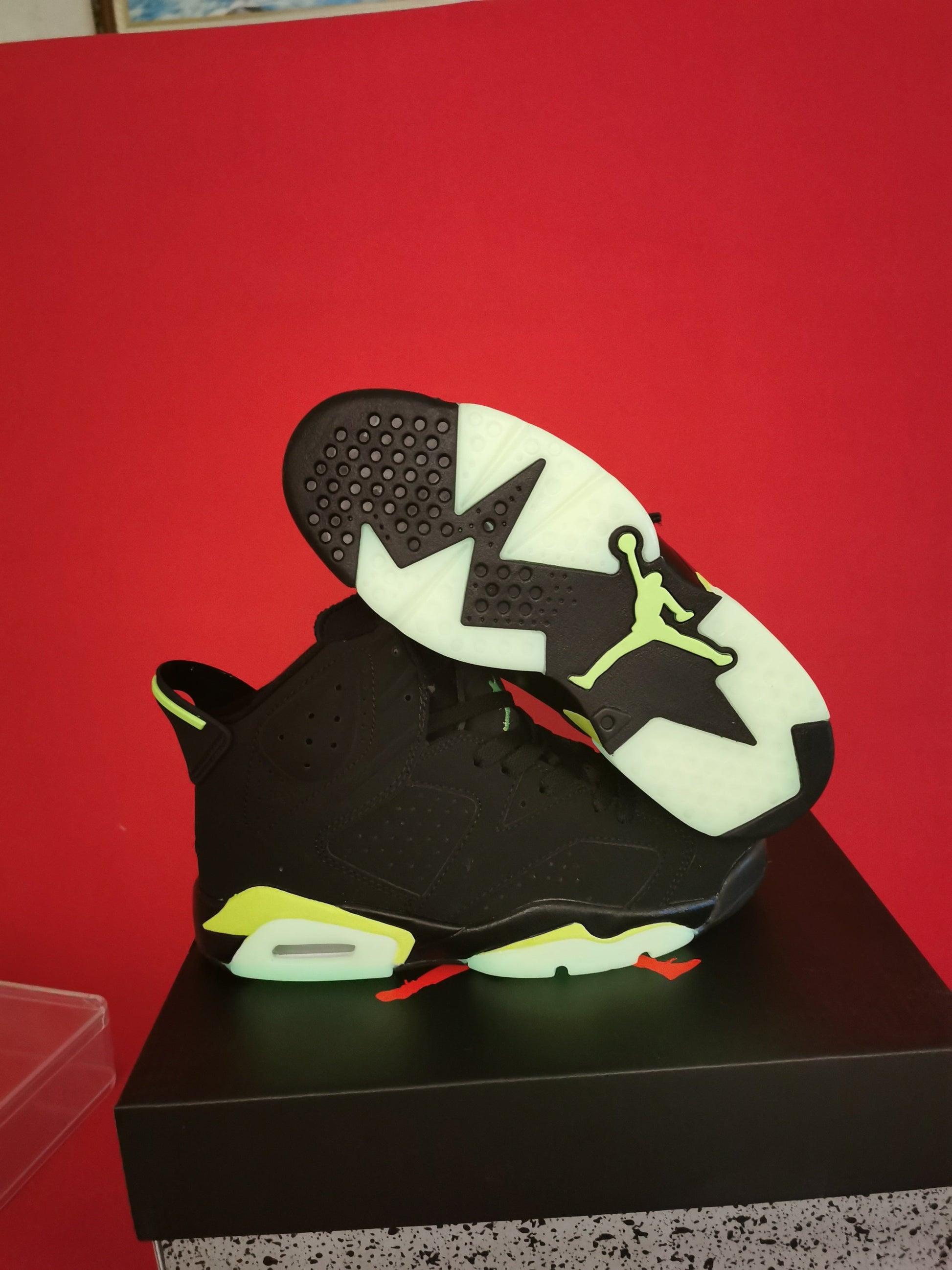 The Air Jordan 6 pictured here features a striking and bold design that is sure to catch the eye. The sneaker is predominantly black, providing a sleek and stealthy base that contrasts dramatically with the neon green accents. This colorway, reminiscent of the classic "Electric Green" theme, adds a vibrant pop to the shoe, particularly on the midsole, heel tab, and Jumpman logo on the tongue and outsole.