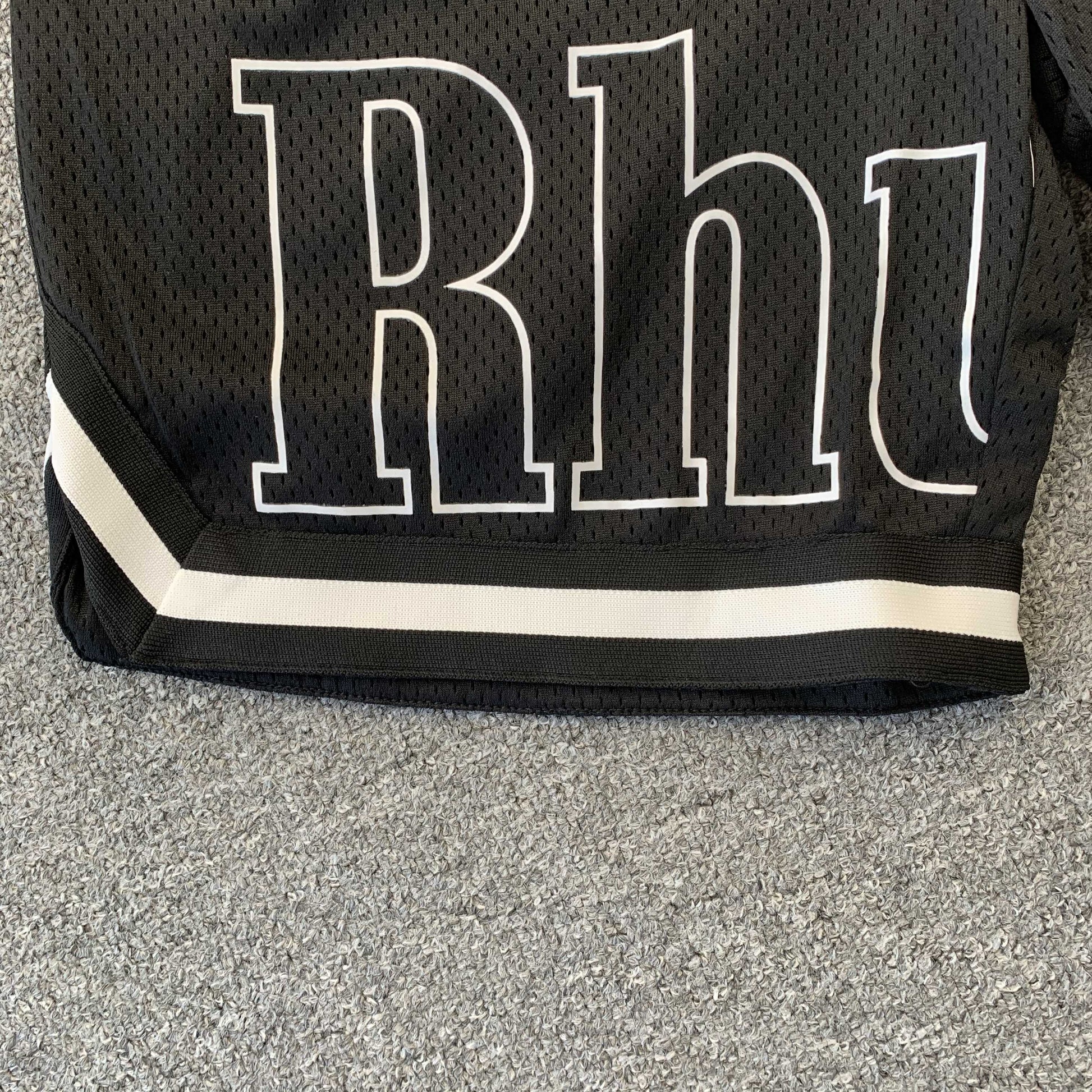 Designed with a black base and contrasting white details, these shorts feature the signature Rhude Court logo on the front, giving them a clean, elevated look. The elongated drawstrings and relaxed fit add to the laid-back West Coast aesthetic, while the elastic waistband ensures a secure and adjustable fit.