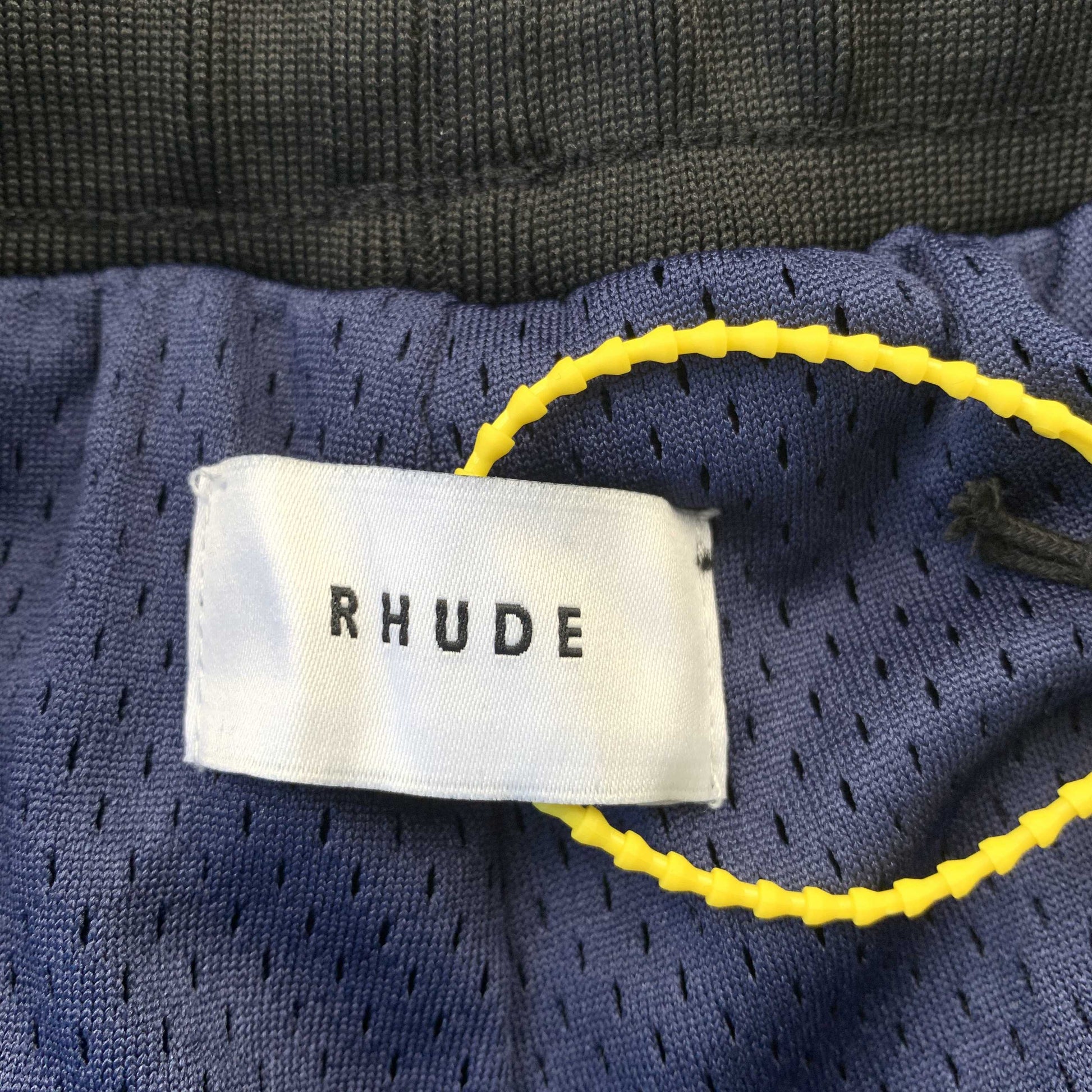 Featuring a deep navy base with the signature Rhude Court logo on the front, these shorts offer a clean, elevated look while maintaining a relaxed, effortless vibe. The elongated drawstrings and elastic waistband ensure a comfortable, adjustable fit, adding to the laid-back West Coast-inspired silhouette.