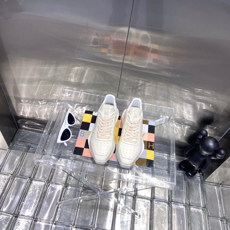 **Premium Materials:** Crafted from high-quality leather, these sneakers promise durability and a luxurious feel. The cream leather upper is smooth and supple, providing both style and comfort. The pink leather accents not only add a pop of color but also highlight the shoe's meticulous craftsmanship. A sturdy rubber sole completes the design, offering excellent traction and support.