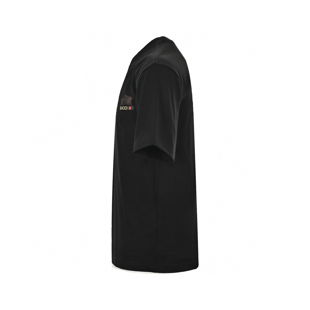 The North Face x Gucci Nature Print T-Shirt in black is a premium blend of outdoor adventure and high fashion. This black t-shirt showcases a striking nature scene print on the back, complete with the iconic logos of The North Face and Gucci. Made from high-quality cotton, it ensures a comfortable and relaxed fit, suitable for everyday wear or outdoor escapades. This collaboration highlights the fusion of style and functionality, making it a distinctive piece for those who appreciate both luxury fashion and the great outdoors. Perfect for adding a unique touch to any casual ensemble.